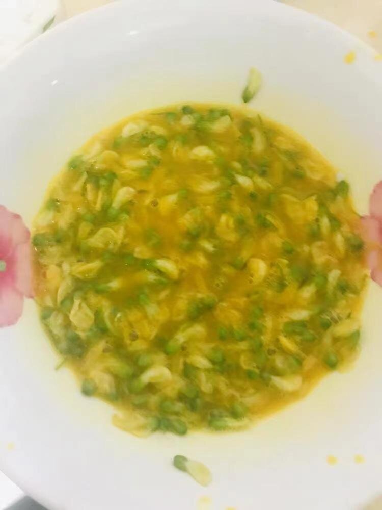 4、磕兩個雞蛋,加入鹽,蛋和花大概1:1比例,攪散,熱鍋熱油下入蛋液筷子不停攪散,蛋液凝固成熟就盛出就好了