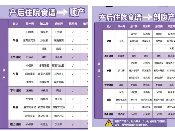 通常情況下,順產(chǎn)的媽媽產(chǎn)后3天就可以出院,剖腹產(chǎn)的媽媽需要5~7天才能回家,而醫(yī)院是不提供月子餐的,所以姐妹們需要提前為寶媽準(zhǔn)備好月子餐,帶到醫(yī)院吃。